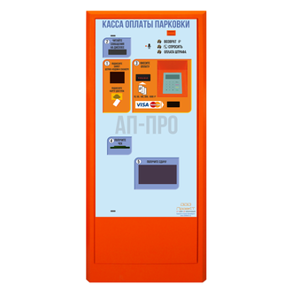 Предназначена для оплаты за услуги парковки в автоматическом режиме. Основные компоненты: контроллер АП-ПРО-КОН, дисплей текстовый монохромный, купюроприемник (принимает пять номиналов купюр), диспенсер купюр (выдача сдачи купюрами двух номиналов), многополосный