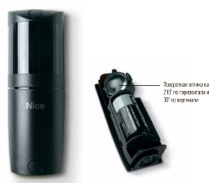 Фотоэлементы Nice F210 дают возможность ориентировать луч на 210° по горизонтальной оси, повышая, таким образом, безопасность установки и упрощая монтаж: так как часто створка автоматизируемых ворот перемещается очень близко от стены и недостаточно места для установки фотоэлементов